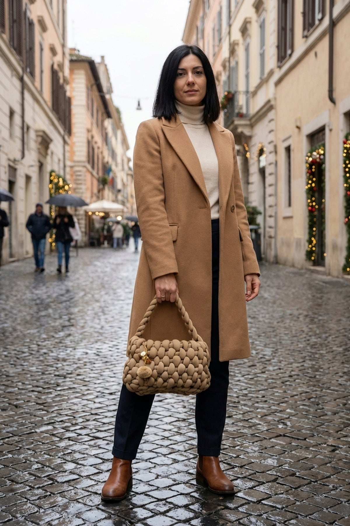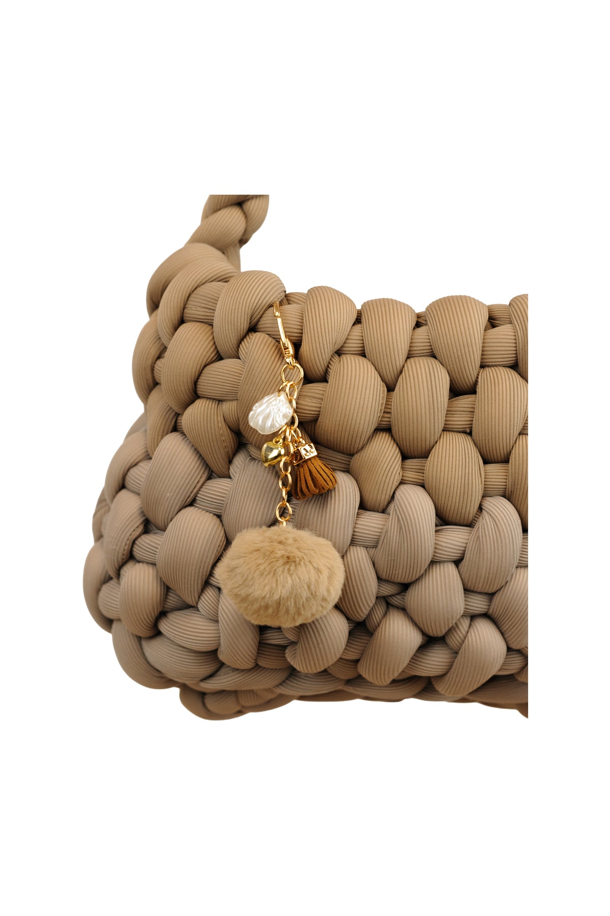 Esclusiva borsa a spalla bicolore. La particolare lavorazione a coste intrecciata esalta l'armonia tra le due diverse tonalità neutre. Arricchita da dettagli dorati e charms con pon-pon, è un accessorio di eleganza naturale e ricercata.