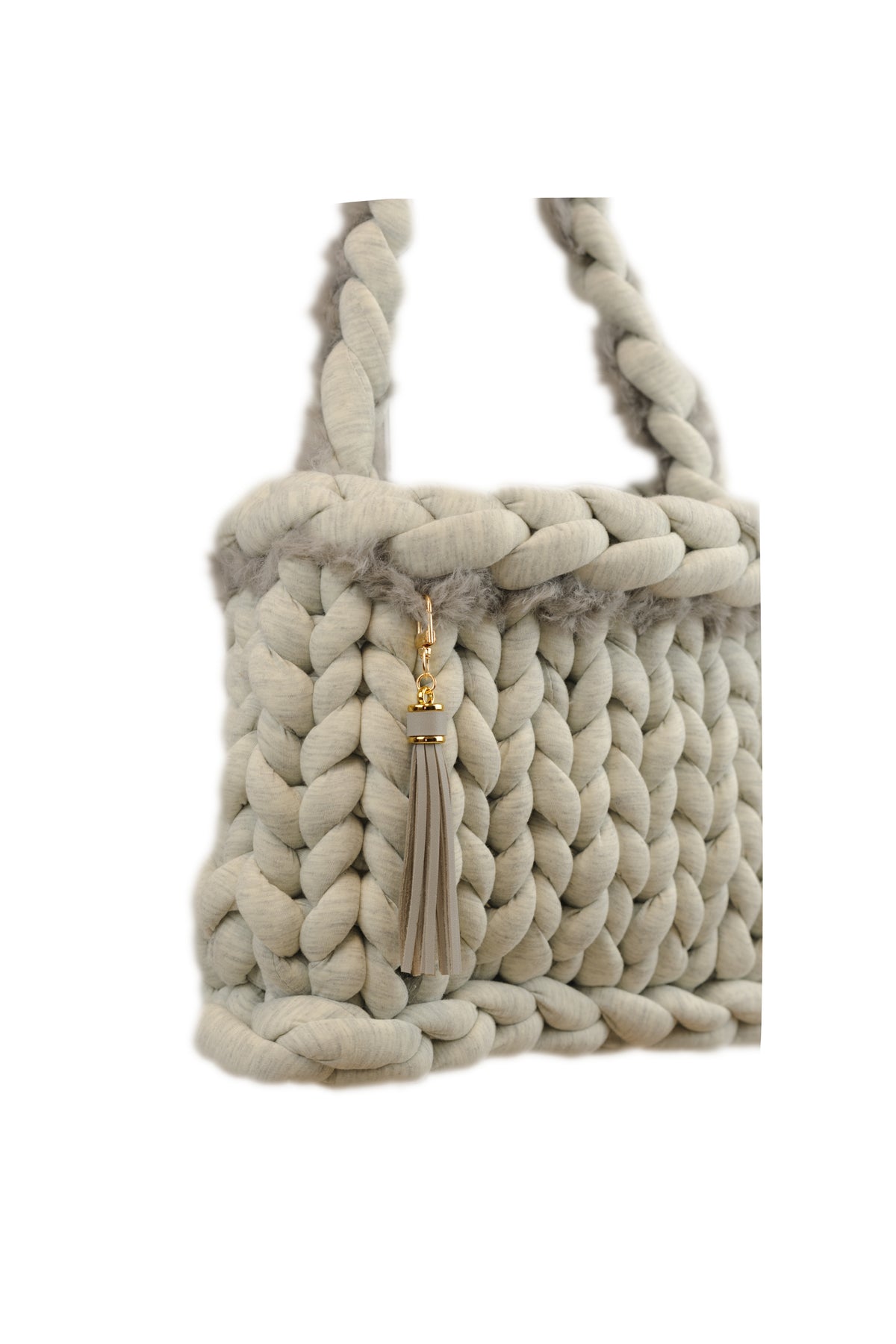 Pezzo unico color ghiaccio. La struttura intrecciata è rifinita da un dettaglio in ecopelliccia tono su tono che dona morbidezza e volume. Impreziosita da una nappa pendente e dettagli dorati, è un accessorio candido dall'eleganza invernale.