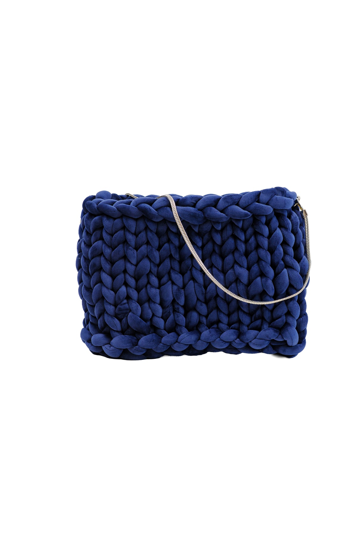 Grande borsa "Rory" in velluto blu, pezzo unico fatto a mano. La morbida trama intrecciata e la tracolla a catena uniscono stile e praticità. Capiente e chic.